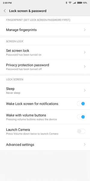 Lock Screen & Password: در این بخش میتوانید در محتواهای صفحه قفل دخل و تصرف داشته باشید علاوه بر اینکه به بخش قفلگذاری و سنسور اثرانگشت هم دسترسی دارید. تعیین میزان روشن ماندن صفحهنمایش هم در این بخش وجود دارد و به طرز عجیبی در بخش تنظیمات صفحهنمایش نیست. در اینجا میتوانید تنظیمی را فعال کنید که با دو بار فشردن کلید ولوم پایین بتوانید دوربین را فعال کنید. در تنظیمات بیشتر این قسمت امکان نوشتن یک کلمه دلخواه روی صفحه قفل بهعنوان امضاء، فعال کردن حالت جیب برای اینکه در جیب صفحهنمایش غیرفعال شود و انتخاب نوع نمایش نوتیفیکیشن ها در صفحه قفل وجود دارد.