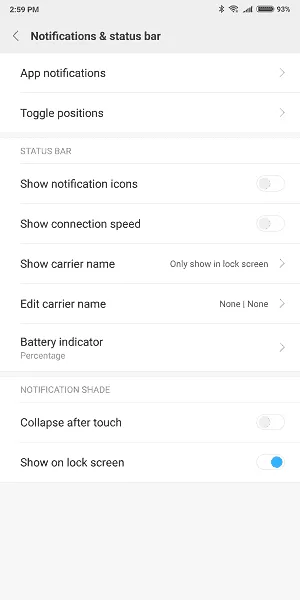 Notifications & Status bar: در این بخش امکان شخصیسازی در نوار ابزار برای کاربر وجود دارد. میتوانید نمایش سرعت شبکه در نوار ابزار را فعال و غیرفعال کنید؛ نوع نمایش نوتیفیکیشن ها را در نوار ابزار تعیین کنید و نوع نمایش میزان باتری مشخص کنید.