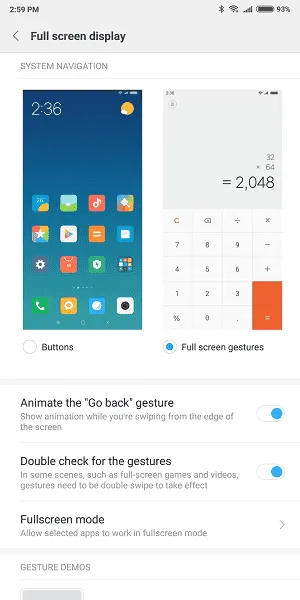Full Screen Display: به شما این امکان را میدهد تا بتوانید از دو حالت برای حرکت در منوهای گوشی بهره ببرید. اولین حالت همان حالت پیشفرض است که با انتخاب آن سه کلید لمسی پایین صفحهنمایش ظاهر میشوند و میتوانید به کمک آنها در منوها حرکت کنید. حالت دوم این سه کلید را حذف میکند و باید با کمک حرکات انگشتانتان بین منوها حرکت کنید. بهطور مثال با کشیدن انگشت از پایین صفحهنمایش به بالا از برنامهها خارج میشوید یا با بالا کشیدن انگشت و کمی نگهداشتن آن روی صفحه لیست برنامههای اخیر را باز کنید.