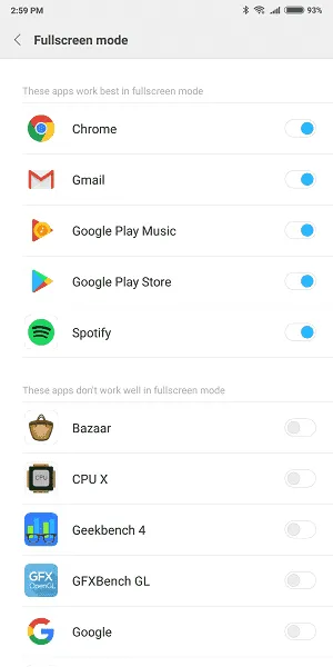 در دل این تنظیم، تنظیم کاربردی دیگری نهفته است که Fullscreen Mode نامیده میشود. در این تنظیم میتوانید لیست برنامههایی را مشاهده کنید که با نسبت ابعاد صفحه گوشی همخوانی دارند و آنهایی که همخوانی ندارند. میتوانید بنا به دلخواه آن برنامههایی که با نسبت ابعاد صفحه همخوانی ندارند را مجبور کنید در حالت تمام صفحه اجرا شوند.