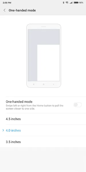 One-handed Mode: در این قسمت امکان این را دارید با کمک کشیدن انگشت به سمت راست یا چپ روی پایین صفحهنمایش محتوای در حال نمایش روی صفحه را در پنچرهای کوچکتر مشاهده کنید. در این بخش میتوانید به گوشی بگویید اگر در این حالت قرار گرفت چه اندازه صفحهای را برای شما نمایش دهد. نکته منفی در مورد این بخش این است که اگر صفحه را در حالت تمام صفحه قرار داده باشید و کلیدهای ناوبری را از پایین صفحهنمایش حذف کرده باشید امکان استفاده از این ویژگی وجود ندارد زیرا با جسجرهای حرکتی خروج از برنامهها و باز شدن برنامههای اخیر تداخل پیدا میکند.