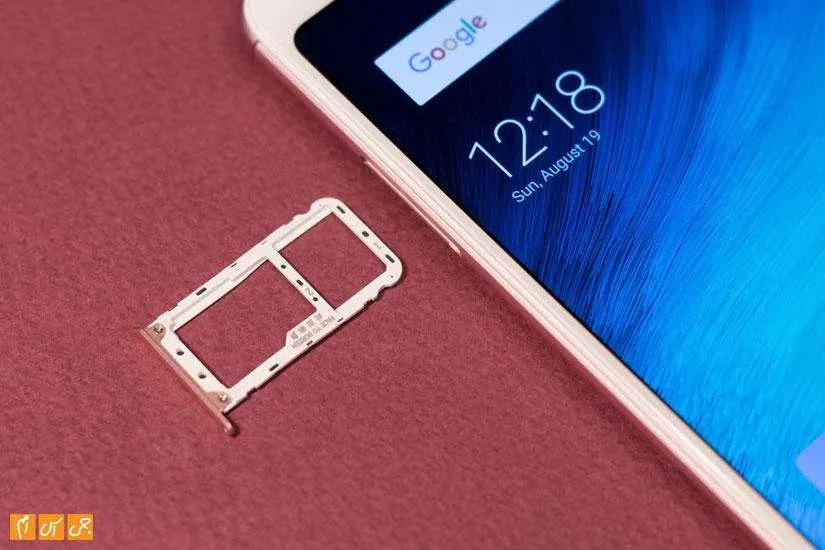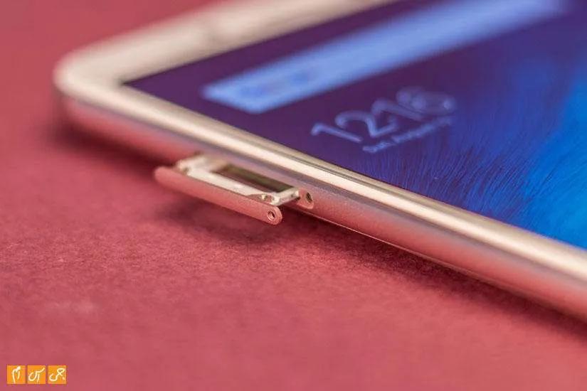 در لبه سمت چپ درگاه سیمکارتها قرار دارد که از دو سیمکارت نانو همزمان پشتیبانی میکند. درگاه سیمکارت دوم در این گوشی هیبریدی است و میتوانید از آن برای استفاده از کارت حافظه خارجی هم استفاده کنید.
