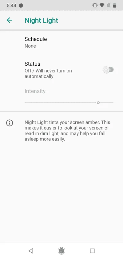 Night Light: این اولین گزینه در بخش تنظیمات صفحهنمایش است که به چشم میخورد. با فعال کردن این بخش پیکسلهای آبی کمنور یا خاموش میشوند و نور زرد روی صفحه غالب میشود. در این بخش امکان زمانبندی برای فعال و غیرفعال کردن این بخش وجود دارد در ضمن اینکه با فعال شدن میتوانید میزان نور زرد را کم و زیاد کنید. این حالت برای زمانی مناسب است که در محیطی تاریک قصد کار کردن با گوشی خودتان را دارید در ضمن اینکه به شما کمک میکند راحتتر به خواب بروید.