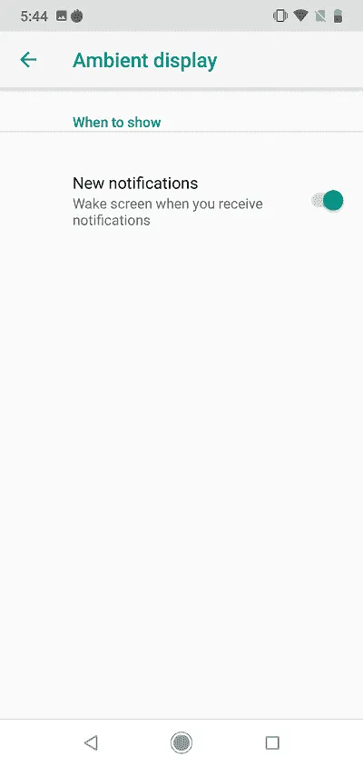 Ambient Display: فعال کردن این تنظیم سبب میشود زمانی که نوتیفیکیشنی جدید برای گوشی میآید صفحه گوشی روشن بشود اما این روشن شدن به صورت کامل نیست. با رسیدن نوتیفیکیشن صفحهنمایش روشن میشود و کاملا مشکی رنگ است و نوشتههای سفید روی آن قرار میگیرند و نوتیفیکیشن را نشان میدهد.