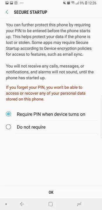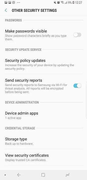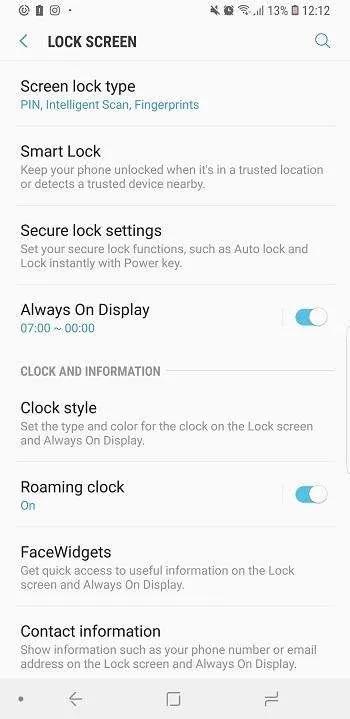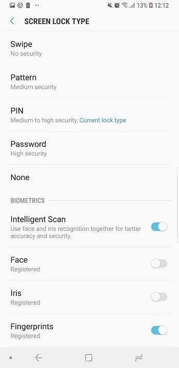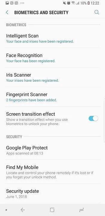 بعد از تنظیم صفحه قفل که بیشتر برای شخصیسازی استفاده میشود به سراغ بخش امنیت و بایومتریک نوت 9 (biometric and security) میرویم که تمامی تنظیمات امنیتی را در خودش جای داده است.