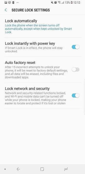 Lock network and security هم تنظیمی کاربردی برای زمانی است که گوشی گم شده یا دزدیده شده باشد. با فعال کردن این تنظیم اجازه خاموش کردن وای فای یا دیتای تلفن همراه زمانی که صفحه گوشی قفل است داده نمیشود.