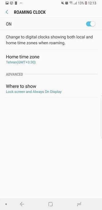 با فعال کردن این تنظیم زمانی که به شبکه رومینگ متصل شوید علاوه بر ساعتی که منطقه زندگی شما را نشان میدهد ساعت دیگری هم نمایش داده میشود تا زمان محلی را برایتان نمایش دهد.