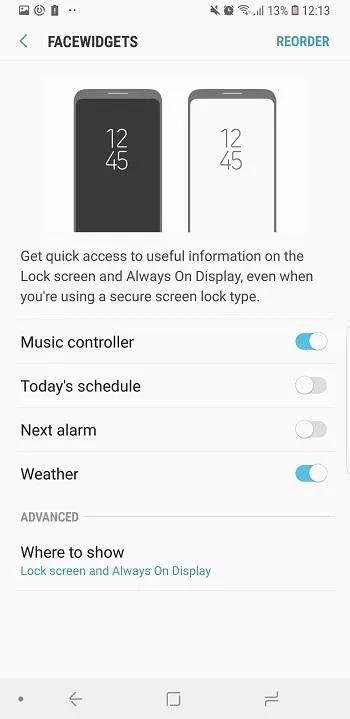 در صفحه Always on علاوه بر ساعت و تاریخ میتوانید با کشیدن انگشت به چپ یا راست به گزینههای دیگری از جمله کنترل موزیک، آلارم یا آبوهوا هم دسترسی داشته باشید. برای اینکه تعیین کنید به کدامیک از این گزینهها در این صفحه دسترسی وجود داشته باشد باید از این بخش هر کدام را که میخواهید فعال یا غیرفعال کنید.