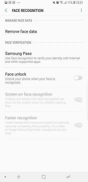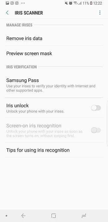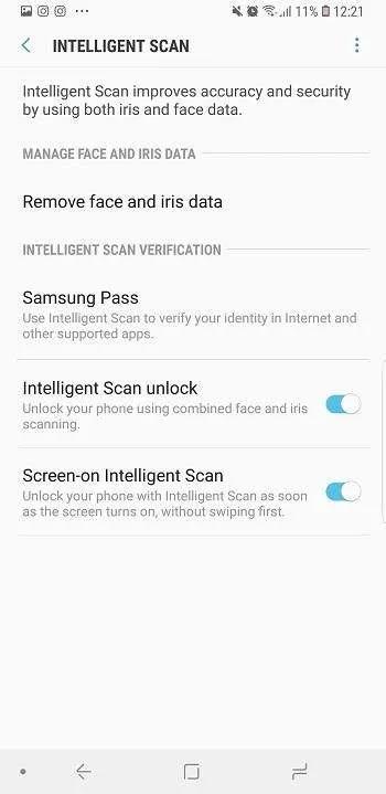 در نوت 9 روشی اضافی وجود دارد که نامش اسکن هوشمند است. اگر این روش را فعال کنید از گوشی میخواهید که از هر دو روش تشخیص چهره و تشخیص عنبیه همزمان استفاده کند و بتوانید قفل صفحه گوشی خودتان را در هر شرایطی باز کنید.