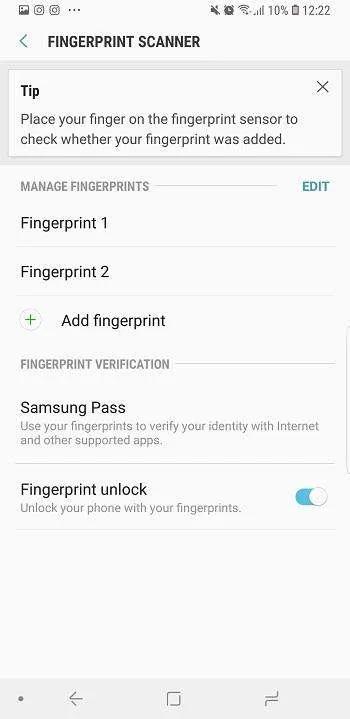 تشخیص اثرانگشت با کمک سنسوری که در قاب پشتی دستگاه قرار دارد و با کمک نرمافزاری که تنظیمش در این بخش است انجام میگیرد. امکان تعریف 4 اثرانگشت در این بخش وجود دارد که میتوانید برای هر کدامیک اسم مخصوص انتخاب کنید.