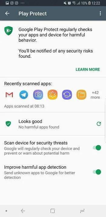 با کمک این تنظیم امنیتی تمام برنامههای شما همواره در حال اسکن کردن توسط گوگل هستند و اگر برنامهای مضر برای گوشی شما پیدا شود به شما هشدار داده خواهد شد. در این تنظیم میتوانید از گوشی بخواهید تا برنامههایی که در لیست برنامههای گوگل پلی هم نیستند برای اسکن شدن به گوگل فرستاده شوند.
