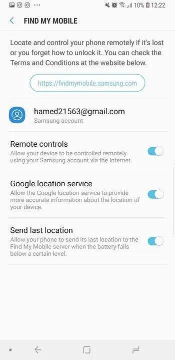 در این تنظیم باید با اکانت سامسونگ خودتان لاگین کنید. بعد از لاگین کردن اگر خدایی نکرده گوشی شما گم یا دزدیده شد میتوانید با رفتن به سایت findmymobile.samsung.com و لاگین کردن با اکانت خودتان از مکان دقیق گوشی هوشمندتان مطلع شوید یا اینکه تغییراتی از جمله پاک کردن اطلاعات گوشی را اعمال کنید. در این بخش تنظیمات دیگری هم وجود دارند که به شما امکان کنترل بیشتر روی گوشی را میدهند. از جمله مهمترین این تنظیمات میتوان به "ارسال آخرین محل گوشی" اشاره کرد که اگر گوشی دزدیده یا گم شده شما خاموش شود آخرین لوکیشن گوشی را قبل از خاموش شدن به شما اطلاع میدهد.