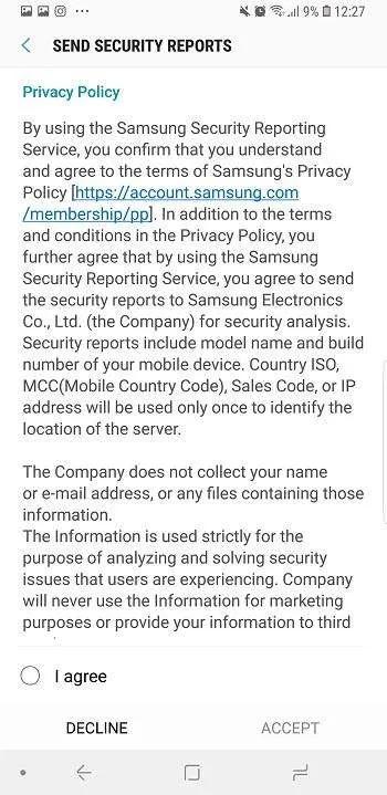 بد نیست که به این تنظیم اجازه فعالیت بدهید. اگر این تنظیم فعال باشد گوشی تنها زمانی که به شبکه Wi-Fi متصل هستید گزارشهای امنیتی را به سامسونگ ارسال میکند تا مهندسان این کمپانی بتوانند با بررسی این گزارشها در بهبود عملکرد امنیتی گوشیهای هوشمند سامسونگ با دید بازتری رفتار کنند. در ضمن گوشی به شما میگوید که تمام این دادهها پیش از ارسال رمزگذاری میشوند و نیازی نیست تا نگران این موضوع باشید.