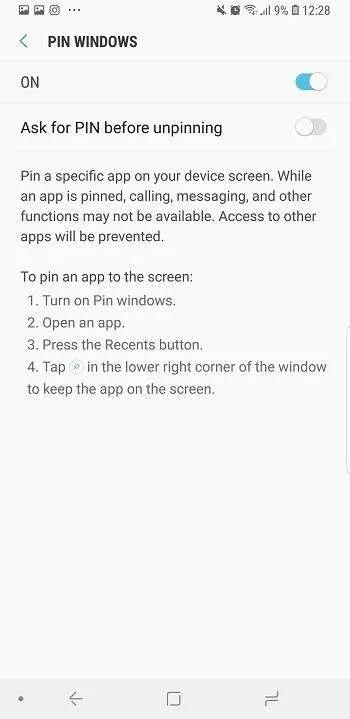 یکی از تنظیمات بسیار جذاب در گوشیهای سامسونگ این تنظیم است. فرض کنید میخواهید گوشی خودتان را به شخصی بدهید تا برنامهای مخصوص را در آن مشاهده کند یا اینکه میخواهید گوشی را به کودک خودتان بدهید تا با آن بازی کند برای اینکه به جز این برنامه یا بازی دسترسی به دیگر برنامهها از بین برود باید از این گزینه استفاده کنید. یکبار که این تنظیم را فعال کنید میتوانید برنامه مورد نظر خودتان را از بخش برنامههای اخیر روی صفحه پین یا به اصطلاح قفل کنید. با این کار برنامهای که پین شده روی صفحه باقی میماند و با فشردن کلید home کاربر نمیتواند از برنامه خارج شود. برای خارج شدن از برنامه دو راه وجود دارد راه اول این است که کلید برنامههای اخیر با کلید بازگشت به عقب با هم نگهداشته شوند و راه دوم که امنیت بیشتری دارد این است که قبل از خارج شدن پسورد پرسیده شود و بنابراین دیگر هیچکس جز خود کاربر نمیتواند از این برنامه پین شده بیرون برود.