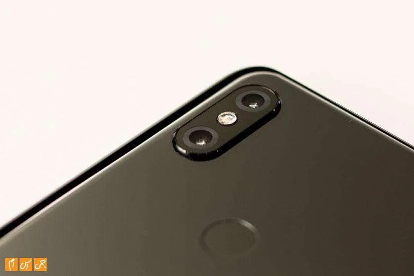 در قاب پشتی دستگاه دو لنز برای دوربین اصلی در نظر گرفته شده که شبیه به دوربینهای آیفون 10 زیر هم قرار دارند و فلاش بین این دو لنز است. قابی که برای دو لنز در نظر گرفته شده کمی از بدنه بیرون زده است اما مشکلی در قرارگیری گوشی روی سطح صاف ایجاد نمیکنند. سنسور اثرانگشت در قاب پشتی و وسطش قرار گرفته است. این سنسور خیلی بزرگ نیست و خیلی هم عمیق طراحی نشده است اما با این وجود بهراحتی میتوانید در قاب پشتی آن را پیدا کنید که این به لطف جنس بدنه است.