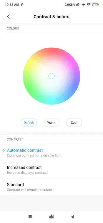 Contrast & Colors: برای رنگها سه حالت پیشفرض، گرم و سرد وجود دارد درحالیکه تنظیمات کنتراست در حالت خودکار باشد. برای کنتراست دو حالت دیگر هم وجود دارد که عبارتاند از کنتراست افزایش یافته و دیگری حالت استاندارد.