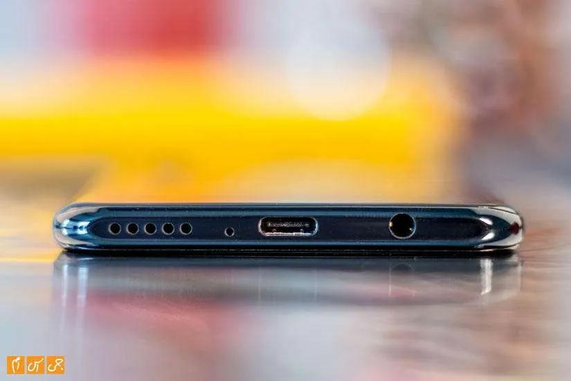 پایین گوشی درگاه ارتباطی از نوع تایپ سی، میکروفون اصلی، اسپیکر و درنهایت جک 3.5 میلیمتری صدا را میبینیم.