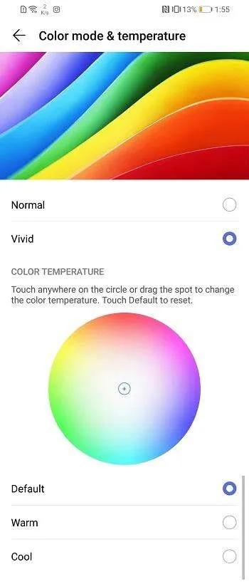 Color Mode & Temperature: در این بخش دو حالت نرمال و ویوید در نظر گرفته شده که میتوانید از طریق آنها میزان روشنایی و شفافیت صفحهنمایش را تغییر دهید. در ضمن اینکه با کمک سه گزینه دیگر که پایینتر هستند و شامل پیشفرض، گرم و سرد هستند میتوانید میزان گرمای رنگها را بهدلخواه خودتان تعیین کنید.