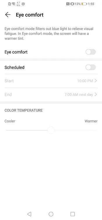 Eye Comfort: این تنظیم برای زمانی مناسب است که در نور کم قصد دارید با گوشی هوشمند خودتان کارکنید. با فعال کردن این تنظیم نور صفحه به زرد متمایل میشود و علت این امر خاموش شدن پیکسلهای آبی یا کم نور شدن آنها است. این نور زرد کمک میکند تا کار کردن با صفحه دستگاه در نور کم راحتتر باشد درعینحال که به خواب راحتتر کمک زیادی میکند.