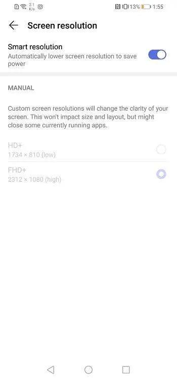 Screen Resolution: در این تنظیم میتوانید کیفیت صفحهنمایش را در سه حالت قرار دهید. حالت اول حالت هوشمند است که با توجه به استفادهای که از صفحهنمایش دارید گوشی کیفیت را در رزولوشن کمتر قرار میدهد تا فشار کمتری به باتری دستگاه وارد شود. در دو حالت دیگر امکان انتخاب بین کیفیت HD و Full HD وجود دارد.