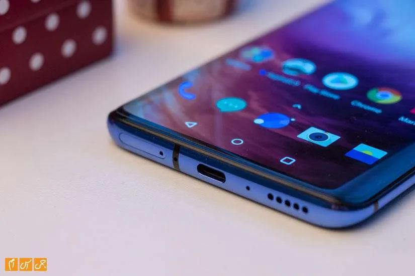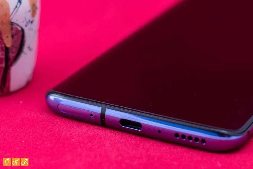 پایین گوشی درگاه ارتباطی دستگاه قرار گرفته که از نوع تایپ سی است و کنار خودش درگاه سیمکارتها، میکروفون اصلی و اسپیکر را میبینید. درگاه سیمکارتها در وان پلاس 7 پرو از دو سیم کارت همزمان پشتیبانی میکند اما با خارج کردن آن با درگاهی بزرگ و بلند روبرو نیستیم و برای اینکه اندازه کوچکی داشته باشد طراحی به صورتی است که سیمکارتهای خودتان را باید در دو طرف آن بگذارید و البته پشتیبانی از درگاه کارت حافظه خارجی هم وجود ندارد.