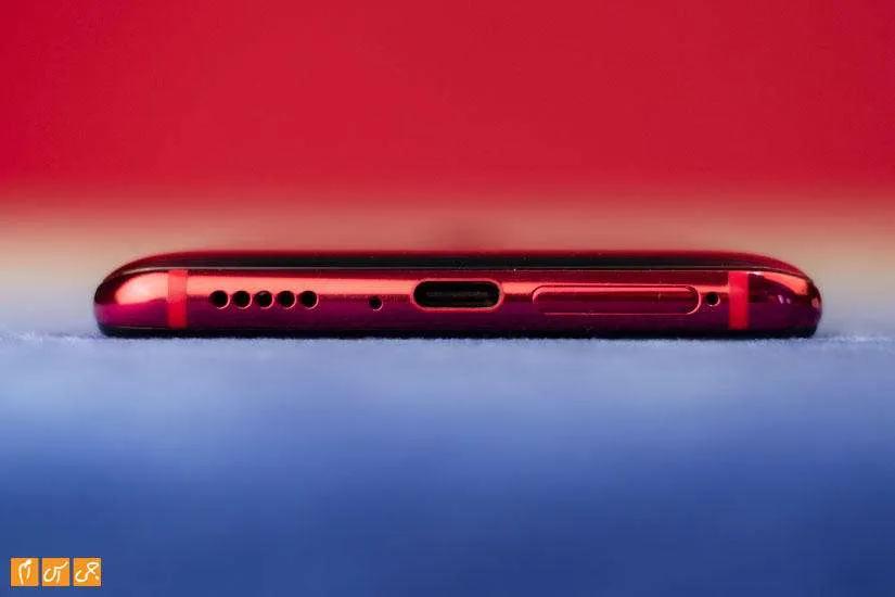 پایین گوشی درگاه ارتباطی را می بنییم که از نوع تایپ سی است و کنار خودش اسپیکر، میکروفون اصلی و درگاه سیم کارت ها را می بیند.