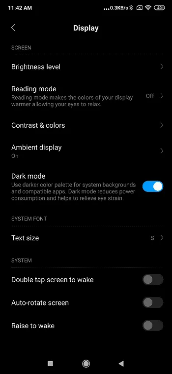 Dark Mode: این تنظیم به تازگی به گوشی های هوشمند راه پیدا کرده است و تمامی برندها در حال استفاده از این ویژگی هستند. با فعال شدن این تنظیم تمامی بخش های سفید گوشی به رنگ مشکی در می آیند و در نهایت به سبب اینکه جنس صفحه نمایش این گوشی از امولد است سبب کاهش مصرف باتری می شود.
