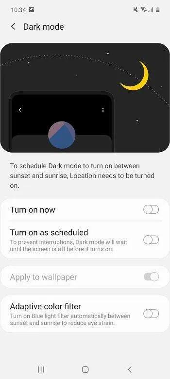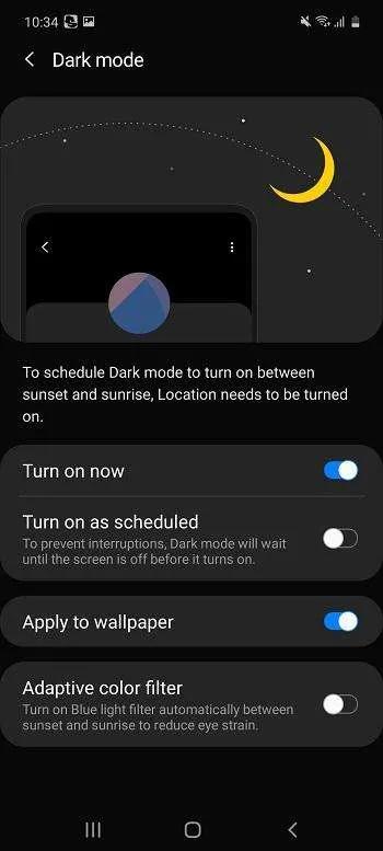 دارک مود ویژگی دیگری است که به لطف رابط کاربری وان یو آی در این گوشی دیده میشود. در حالت دارک مود تمام منوی گوشی به رنگ مشکی در میآید و همین امر سبب میشود مشاهده محتوا در محیط تاریک راحتتر شود و به علاوه باتری کمتری مصرف شود به سبب اینکه جنس صفحهنمایش سوپرامولد است و زمان نمایش رنگ مشکی پیکسلها خاموش میشوند.