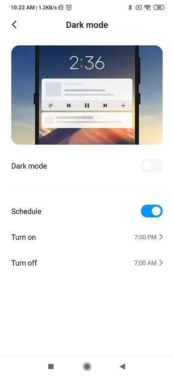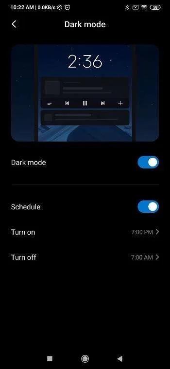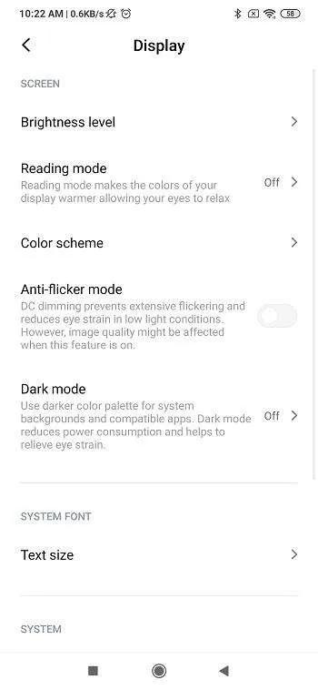 Dark Mode: این تنظیم این امکان را میدهد تا با فعال شدندش تمام رنگهای سفید در منوی گوشی به رنگ مشکی تغییر کند و بنابراین در نور کم فشار بسیار کمتری به چشمان کاربر وارد شود در عین حال که مشاهده محتوا در این حالت هم خیلی آسانتر است. در عین حال به لطف استفاده از صفحه نمایش امولد زمانی که این تنظیم فعال میشود به سبب اینکه صفحه نمایش برای نمایش رنگ مشکی پیکسلها را خاموش میکند مصرف باتری کاهش پیدا میکند.
