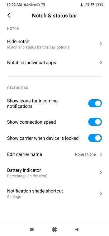 Notch & Staus Bar: در این بخش میتوانید بخش بالای صفحه نمایش را با توجه به سلیقه خودتان شخصی سازی کنید به این صورت که با ریختن رنگ مشکی در اطراف ناچ آن را مخفی کنید یا اینکه از گوشی بخواهید درصد باتری را در کنار یا داخل آیکون باتری نشان دهد یا …. .
