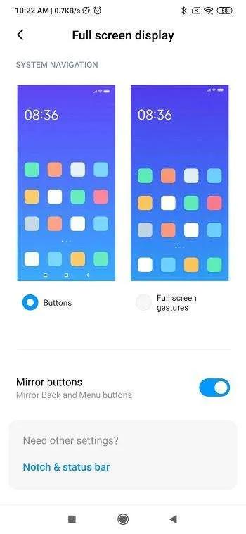 Full Screen Display: در این بخش میتوانید کلیدهای ناوبری را میتوانید تنظیم کنید به این صورت که چیدمان این کلیدها را تعیین کنید یا اینکه در کل کلیدهای ناوبری را حذف کنید و تعامل را با گوشی به این صورت انجام دهید که با استفاده از حرکات جسجری در منوها حرکت کنید.