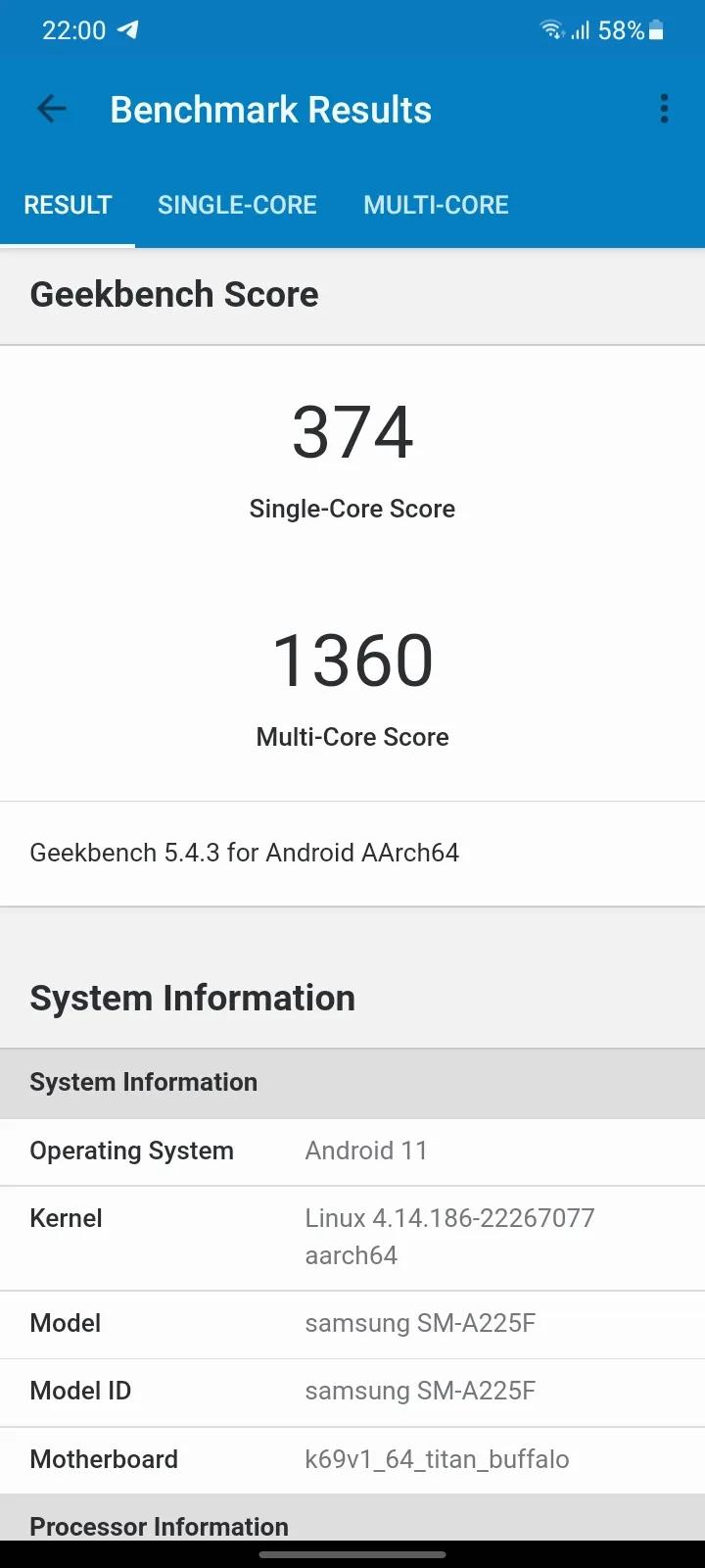 حافظه داخلی گوشی از نوع eMMC 5.1 بوده و همانطور که پیش از این به آن اشاره کردیم؛ گلکسی A22 4G از کارتهای حافظه microSD نیز پشتیبانی میکند. در تست ما از این گوشی در بنچمارک Geekbench، گلکسی A22 توانست در بخش تک هستهای امتیاز ۳۷۴ و در بخش چند هستهای، امتیاز ۱۳۶۰ را به خود اختصاص دهد.