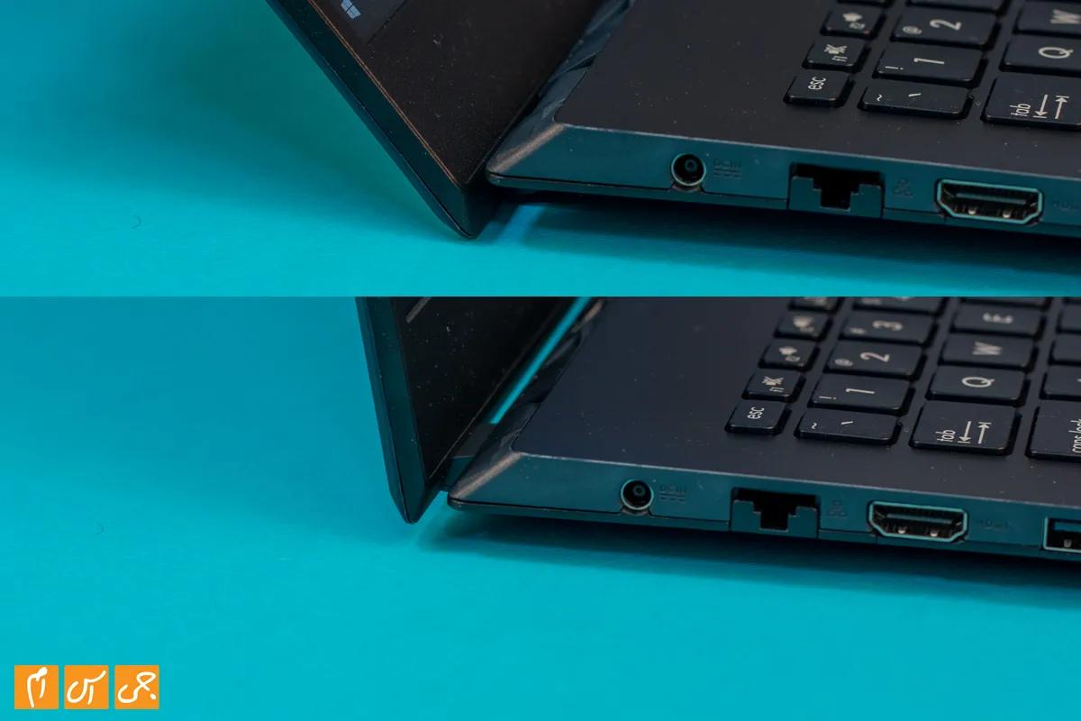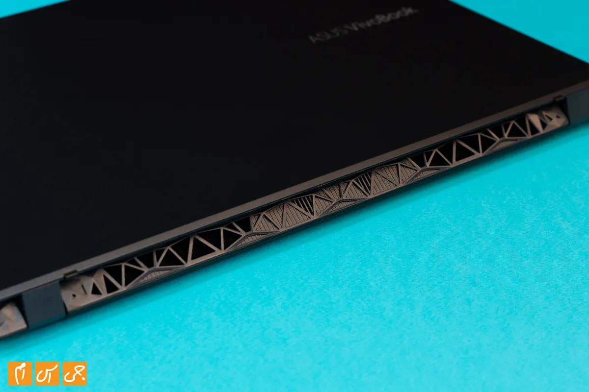 در بخش پایینی این لپتاپ هم پنل به شکلی ساخته شده که هوا به اندازه کافی برای فنهای لپتاپ تامین شود. در کل باید به طراحی این لپتاپ نمره قبولی بدهیم. این محصول سعی ندارد خودش را جای یک لپتاپ گیمینگ جا بزند و یا حتی سعی کند با شبیه مک بوک شدن، مخاطبین دیگری را جذب کند؛ این لپتاپ طراحی و کاراکتر خاص خودش را دارد که حسابی هم به آن میآید.