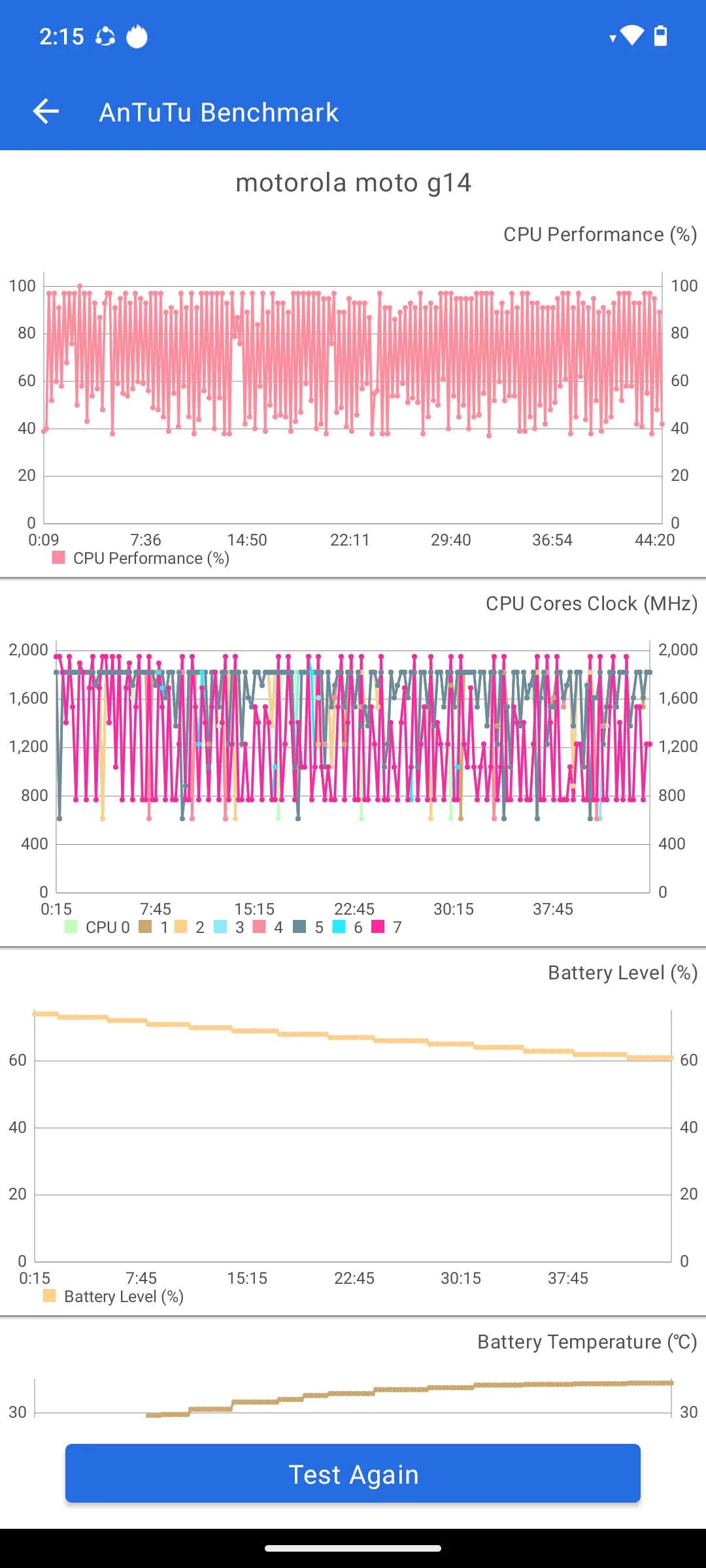 در تستهای سختافزاری و استرس تست هم با توجه به پردازنده اقتصادی، عملکرد به نسبت پایداری داشت و در اکثر مواقع، عملکرد بالای 80 درصد پردازنده را شاهد بودیم و باز هم در کمال تعجب دما گوشی از 35 درجه بالاتر نرفت که بسیار عملکرد خوبی بود. باتری 5000 میلیآمپرساعت هم انتخاب معقولی بود که به ازای هر بار شارژ صد درصدی در حالت استفاده معمولی، زمان آماده بهکار یک روز را در اختیارتان قرار میدهد. اما نقدی که در این بخش به موتو G14 وارد است، پشتیبانی از فناوری شارژ سریع 15 وات است که به طبع زمان زیادی را برای شارژ صفر تا صد درصدی باتری هدر میدهد و موتورولا میتوانست پشتیبانی از شارژ سریع 25 وات را برای این گوشی در نظر میگرفت.