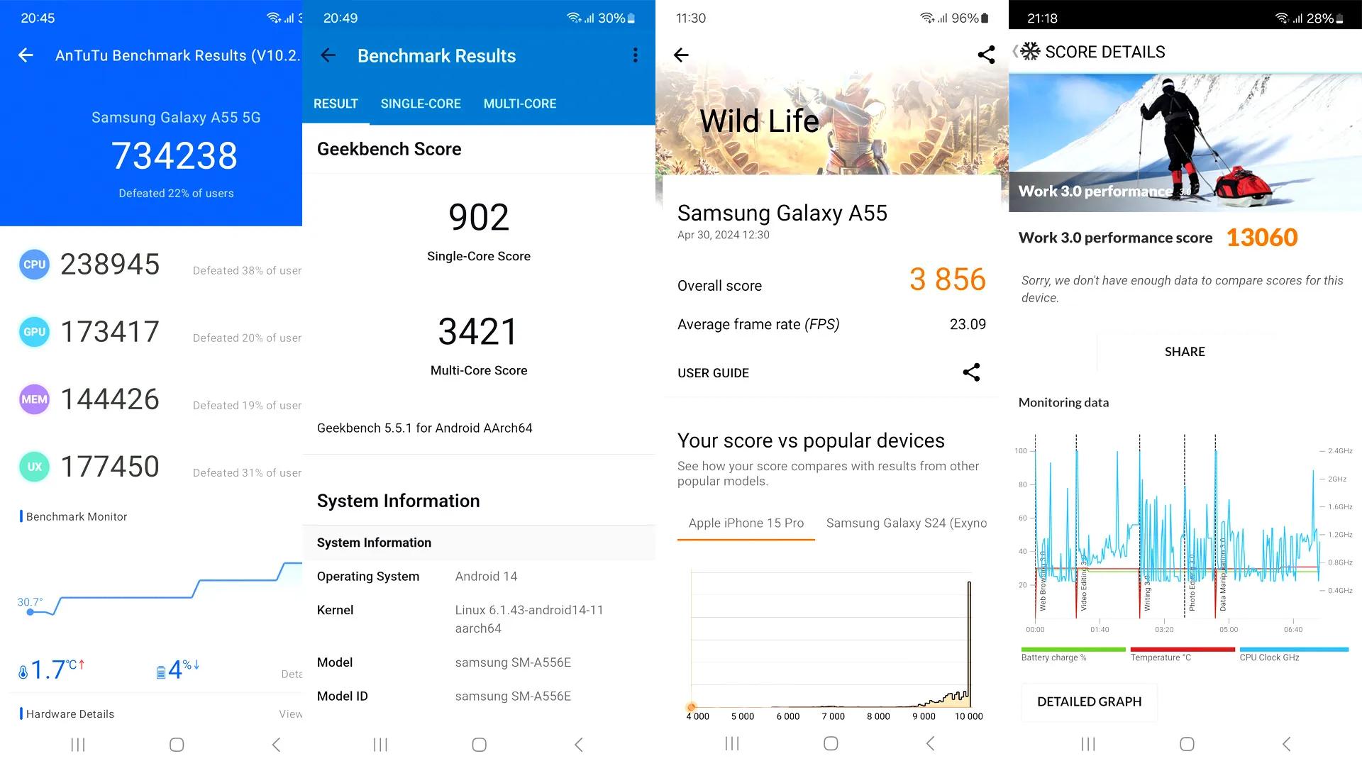 پیشرفت گلکسی A55 سامسونگ را میتوانیم با نتایج بدست آمده در بنچمارک آنتوتو مشاهده کنیم؛ البته مادامی که آن را رقبای هم قیمت و همرده خود مقایسه نکنیم. اصلیترین رقیب این دستگاه، شیائومی پوکو ایکس ۶ پرو است که با برخورداری از تراشه دایمنسیتی ۸۳۰۰ اولترا به راحتی در تمامی تستها میانرده سامسونگ را با اختلاف شکست میدهد.