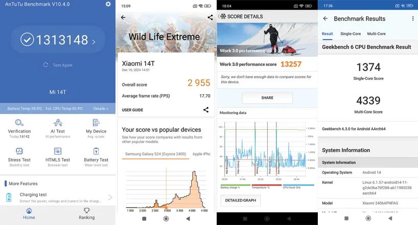 شیائومی 14T در اجرای بنچمارکهایی نظیر آنتوتو، 3DMark و گیکبنچ بسیار موفق عمل کرد و توانست امتیازهای بالایی دریافت کند. البته دور از انتظار نبود؛ چرا که دایمنسیتی ۸۳۰۰ اولترا یکی از تراشههای قدرتمند بازار به حساب میآید.