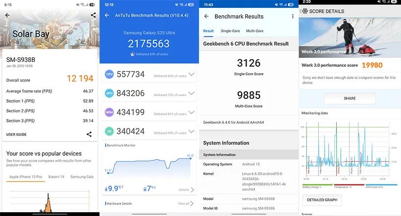 برای سنجیدن توان پردازشی این پرچمدار قدرتمند به سراغ بنچمارکهای معتبر رفتیم که نتایج بدست آمده در مقایسه با سایر پرچمدارهایی که از این تراشه استفاده میکنند، تقریبا نزدیک بود.
