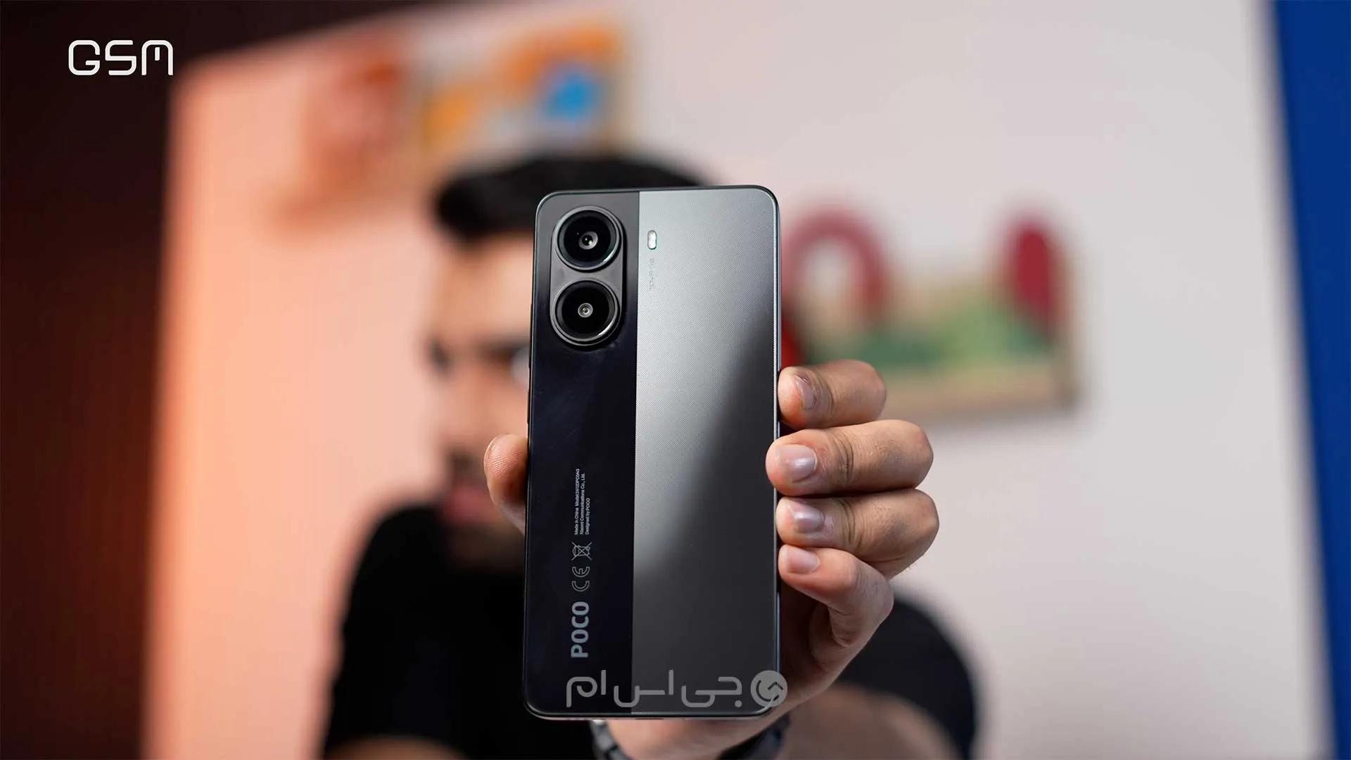در این قاب یک ماژول کپسولی شکل برای دوربین در نظر گرفته شده که دو لنز برجسته را در خود جای داده است. به علت برجستگی این سیستم دوربین، دستگاه روی سطوح صاف کمی تکان میخورد که میتوان مشکل آن را به کمک قاب رفع کرد. فلش هم در کنار این ماژول قرار گرفته و لوگو پوکو هم در بخش پایین قاب به چشم میخورد.