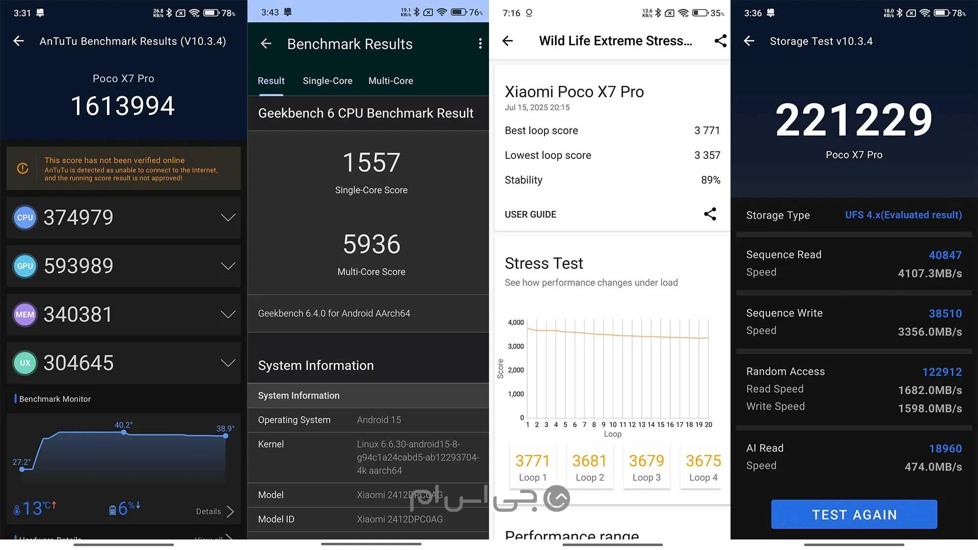 با وجود گرمای پردازنده، پوکو ایکس ۷ پرو توانست در استرس تستها به عدد ۸۰ درصد پایداری عملکرد دست یابد که نشان میدهد گرما تاثیر چندانی روی عملکرد دستگاه ندارد.