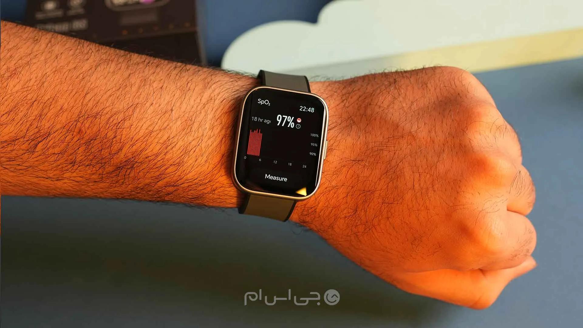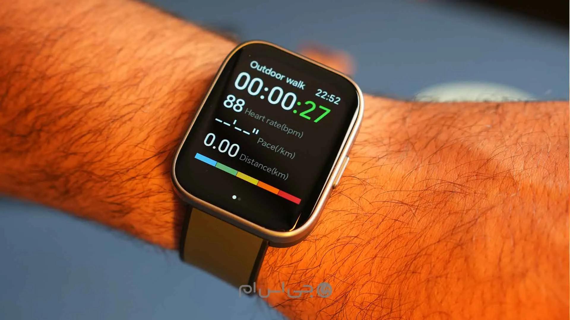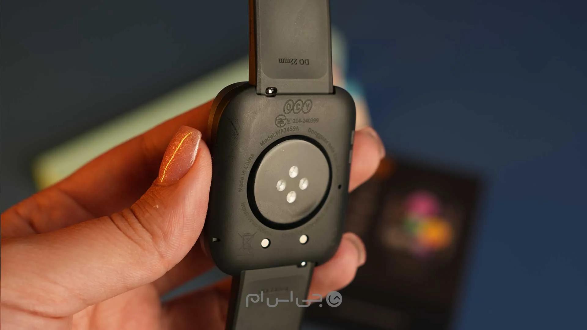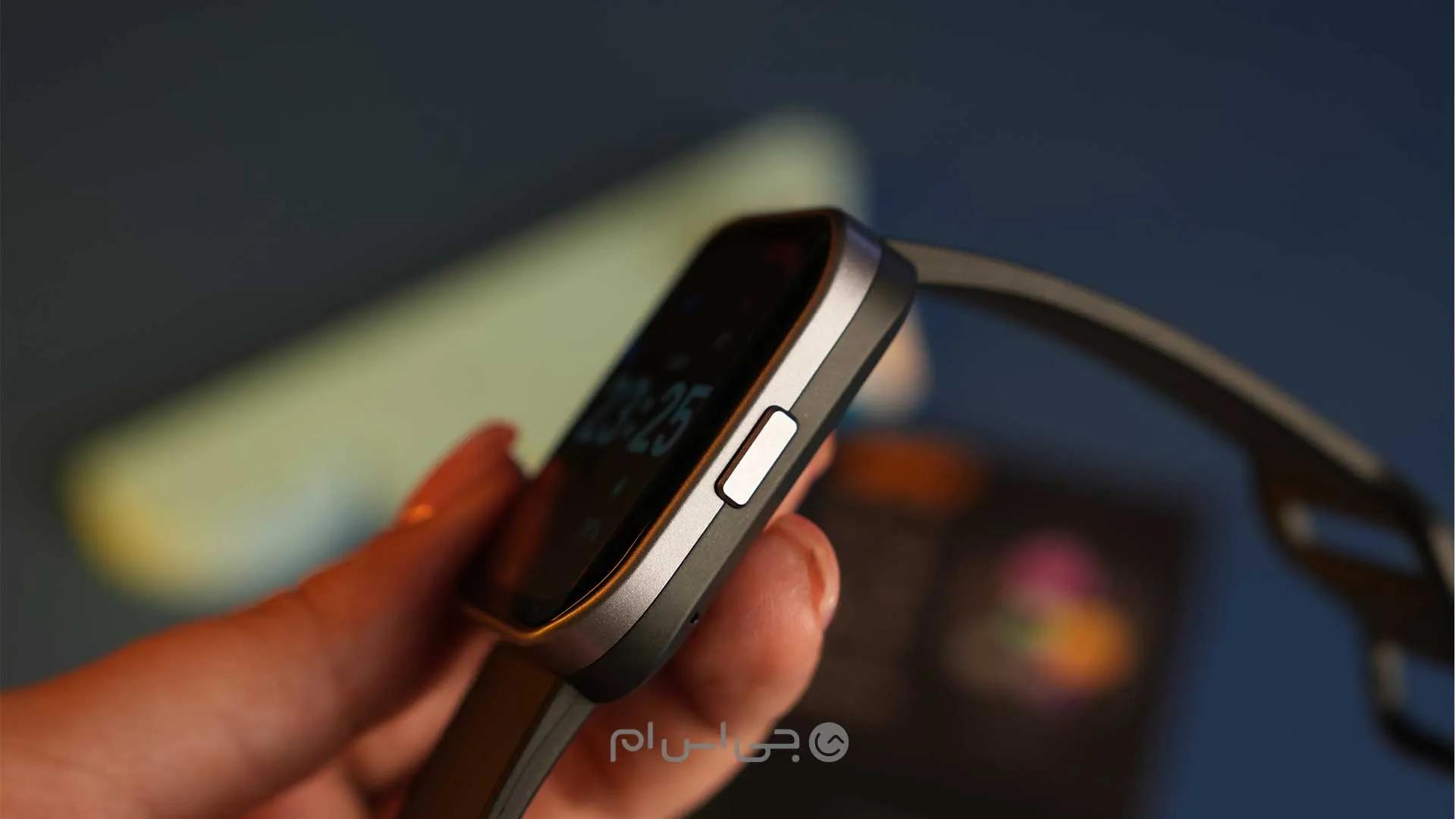 در سمت راست فریم یک دکمه به همراه میکروفون قرار گرفته و شیار اسپیکر هم در سمت چپ فریم قرار دارد. بخش پشتی فریم هم طراحی مات دارد که در مرکز آن، سنسورهای سلامتی با پوششی شفاف قرار گرفتهاند. استانداردهای ساعت و پینهای شارژ هم در این بخش قرار گرفتهاند. بندها از جنس سیلیکون ساخته شدهاند و قلابهایی در بخش اتصال به ساعت برای جداسازی آنها وجود دارد.