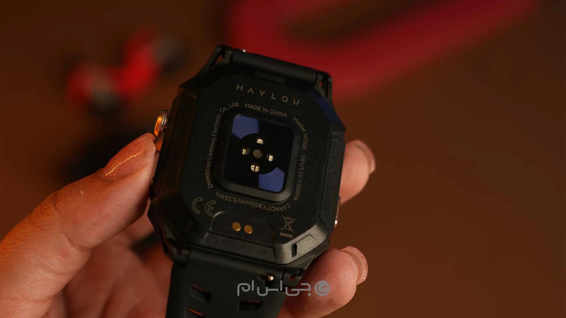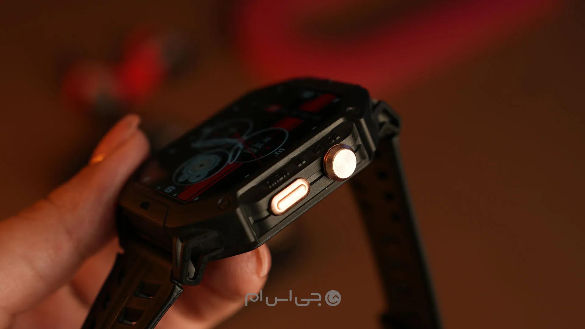 در بخش راست این فریم دکمههای پاور و منو قرار گرفته و دکمه حالتهای ورزشی به همراه میکروفون در سمت چپ آن قرار گرفته است. پوشش مات فریم مانع جذب اثرانگشت میشود و ظاهر ساعت را جذابتر کرده است. روی قاب پشتی ساعت هم شاهد قرارگیری پینهای شارژ و سنسورهای سلامتی هستیم که به صورت برجسته طراحی شدهاند.