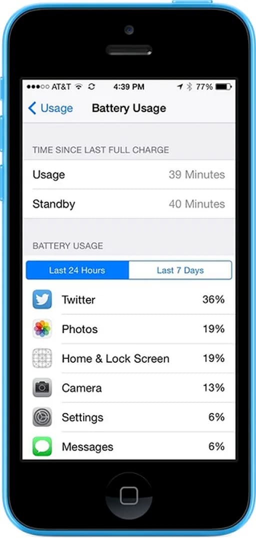 بدین ترتیب شما می توانید زمانی که باتری کمی دارید از باز کردن اپلیکیشن های پرمصرف پرهیز کنید. بدین ترتیب در iOS8 میزان مصرف هر اپلیکیشن در 24 ساعت گذشته و همینطور 7 روز گذشته را شما می توانید مشاهده کنید.