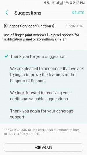 یکی از شرکتکنندگان برنامه گلکسی بتا پیشنهاد داد که سنسور اثر انگشت باید مانند گوشیهای گوگل پیکسل عمل کند که در زمان سوایپ یا کشیدن انگشت از بالا یا پایین روی سنسور، کاربر بتواند نوار اعلانها را پایین بکشد یا آن را مخفی کند. همانطور که در تصویر بالا مشاهده میکنید سامسونگ در پاسخ از پیشنهاد این کاربر قدردانی کرده است.